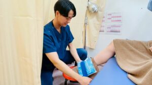 ②アイシング、干渉波、超音波を用いて腫れ、痛み、炎症を取り除く処置をしていきます。